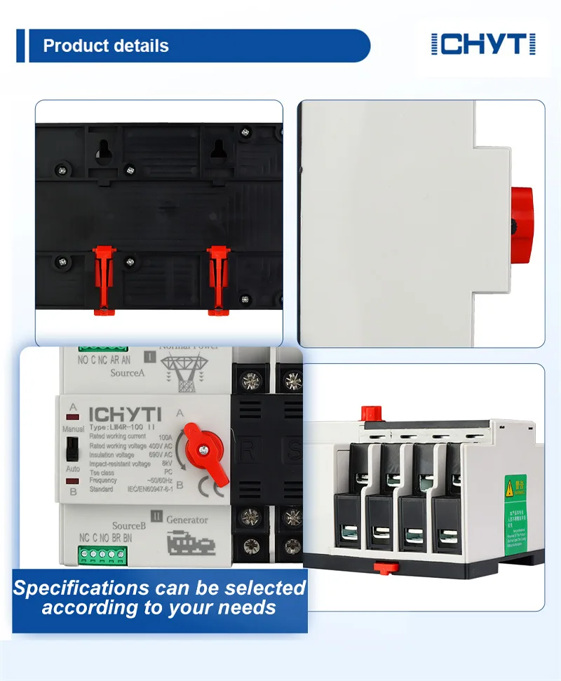 சைனா ஃபேக்டரி ICHYTI 100amp தானியங்கி பரிமாற்ற சுவிட்ச் 50 அல்லது 60Hz இல் 400V மற்றும் 100A AC மதிப்பீட்டைக் கொண்ட அவசர மின் விநியோக அமைப்புகளுக்கு ஏற்றது. அதன் சிறிய வடிவமைப்பு, நம்பகமான பரிமாற்ற செயல்பாடு, எளிதான நிறுவல் மற்றும் பராமரிப்பு மற்றும் நீண்ட ஆயுட்காலம் ஆகியவை இதை ஒரு பிரபலமான தேர்வாக ஆக்குகின்றன. 100amp தானியங்கி பரிமாற்ற சுவிட்ச் பல்வேறு பயன்பாடுகளுக்கு ஏற்றது, அங்கு தொடர்ச்சியான மின்சாரம் அவசியம் மற்றும் மின்சாரம் மற்றும் கைமுறையாக இயக்க முடியும். LW2R தொடர் 100amp தானியங்கி பரிமாற்ற சுவிட்ச் குறைந்த மின்னழுத்த சுவிட்ச் கியர் மற்றும் கட்டுப்பாட்டு கியர்களுக்கான IEC60947-6-1 இன் தேவைகளுக்கு இணங்குகிறது.