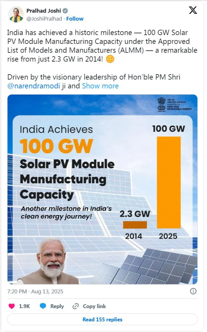 இந்திய புதிய புதுப்பிக்கத்தக்க எரிசக்தி கூட்டணியின் அமைச்சர் பிரகாத் ஜோஷி, இந்த சாதனையை வலியுறுத்தினார்: "இந்தியா ஒரு வரலாற்று மைல்கல்லை எட்டியுள்ளது - அங்கீகரிக்கப்பட்ட மாதிரிகள் மற்றும் உற்பத்தியாளர்கள் பட்டியலில் (ALMM), சூரிய ஒளி மின்னழுத்த தொகுதி உற்பத்தி திறன் 100 ஜிகாவாட்களை எட்டியுள்ளது. பிரதமர் நரேந்திர மோடியின் தலைமை மற்றும் மாற்றும் முயற்சிகளின் உந்து சக்தி திறமையான சோலார் மாட்யூல் உற்பத்தி இணைக்கப்பட்ட ஊக்கத் திட்டமாக (பிஎல்ஐ), இந்தியா வலுவான மற்றும் தன்னிறைவு பெற்ற சூரிய உற்பத்தி சுற்றுச்சூழல் அமைப்பை உருவாக்கி வருகிறது. இந்த சாதனை ஆத்மநிர்பர் பாரத் நோக்கிய வேகத்தை மேம்படுத்துவதோடு, 2030 ஆம் ஆண்டுக்குள் 500 ஜிகாவாட் புதைபடிவ ஆற்றல் உற்பத்தி திறனை எட்டுவதற்கான இலக்கை அடைய இந்தியா உதவும்.