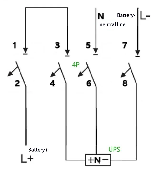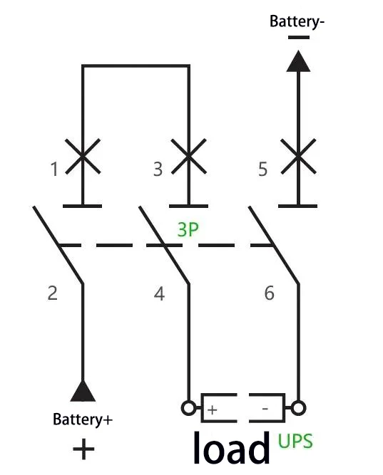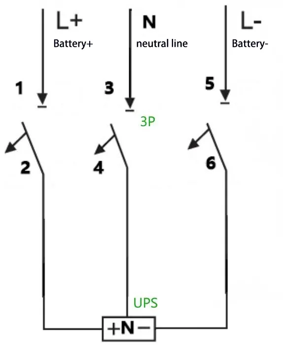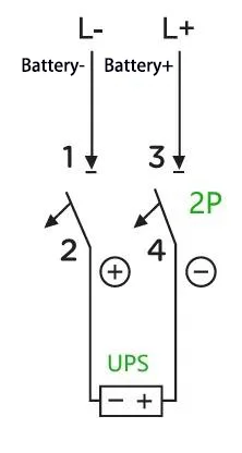 மின்:எடுத்துக்காட்டாக: 40 kVA திறன் கொண்ட UPSக்கு, 40 செல்களின் மதிப்பிடப்பட்ட பேட்டரி சரம் மற்றும் நடுநிலை வயர் இணைப்பு (சமமான சார்ஜ் மின்னழுத்தம்: 14 V × 40 = 560 V, அதாவது, ± 280 V), அதிகபட்ச இயக்க மின்னோட்டம் 40 kVA × 10% 10 ÷ 10 ÷ 90 என கணக்கிடப்படுகிறது. A. A 4P 750 V 150 A சர்க்யூட் பிரேக்கரை ஏற்றுக்கொள்ளலாம், அதன் இரண்டு துருவங்கள் தொடரில் இணைக்கப்பட்டுள்ளன. வயரிங் முறை பின்வருமாறு: